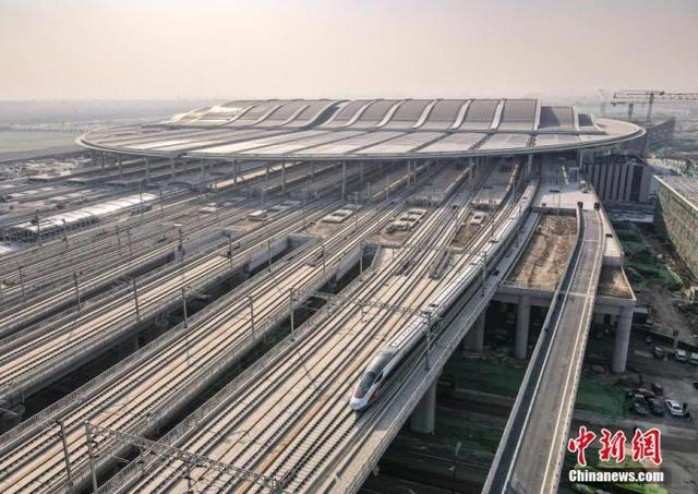 资料图:航拍雄安开往北京西的C2704次列车驶出雄安站。中新社记者 贾天勇 摄