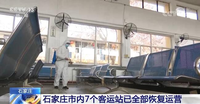 央视网消息:来关注常态化疫情防控。随着河北石家庄全面复工复产,昨天(2月23日),石家庄公路主枢纽白佛客运站恢复运营,今天西王客运站也正式恢复运营。截至目前,石家庄市内7个客运站全部恢复运营,其中,石家庄客运总站重点区域将每4个小时消杀一次,省际市际包车客座率控制在90%以内。