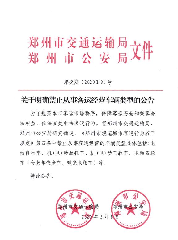 5月18日,记者从郑州市交通管理局获悉,为了规范郑州市客运市场秩序,保障客运安全和乘客合法权益,依法查处非法客运行为,经郑州市交通运输局、郑州市公安局研究确定,《郑州市规范城市客运行为若干规定》第四条中禁止从事客运经营的车辆类型具体包括:电动自行车、机(电)动摩托车、机(电)动三轮车、电动四轮车(含老年代步车、观光电瓶车)等。