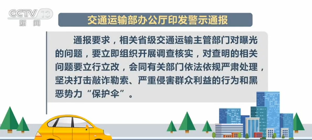 通报要求,相关省级交通运输主管部门对曝光的问题,要立即组织开展调查核实,对查明的相关问题要立行立改,会同有关部门依法依规严肃处理,坚决打击敲诈勒索、严重侵害群众利益的行为和黑恶势力“保护伞”。